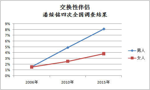 喜欢交换性伴侣的比例男性比十年前增加了5.0倍,女性增加了2.5倍。为什么不是同比例增长?如果数据真的是这样的话,意味着在有交换行为人群中:平均每个女人被两个男人作为对象交换过。