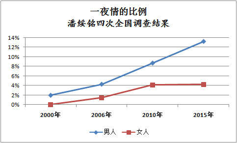 看这个趋势图,大多数人估计已经大惊失色了。2015年调查报告显示13%的男人,4%的女人有过一夜情。你会不会喊“被一夜情”了?