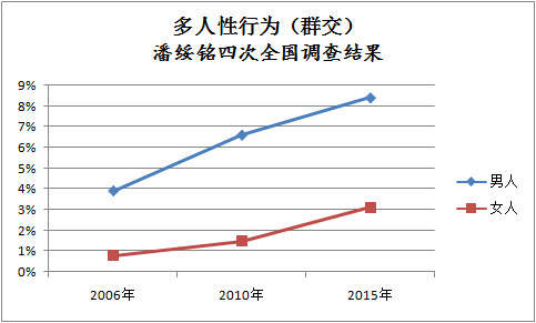 2015年数据,这张图和上一张交换伴侣的比例实际上差不了多少,基本上可以说有交换行为的男女几乎都有多人性行为的情况发生。