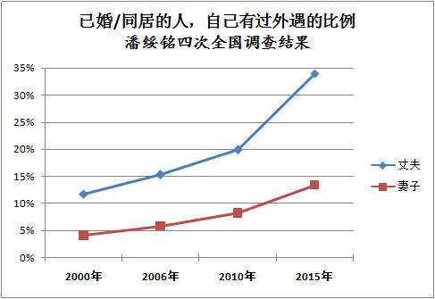 从趋势来看,男女外遇比例,2015年比2010年都有加速的迹象。照此趋势合理联想,2020年的调查数据会不会50%的男人,25%的女人外遇过?这样真的好吗?