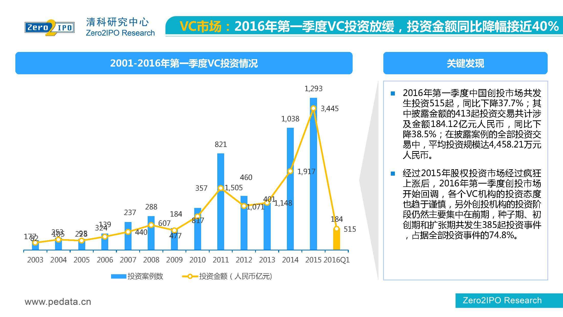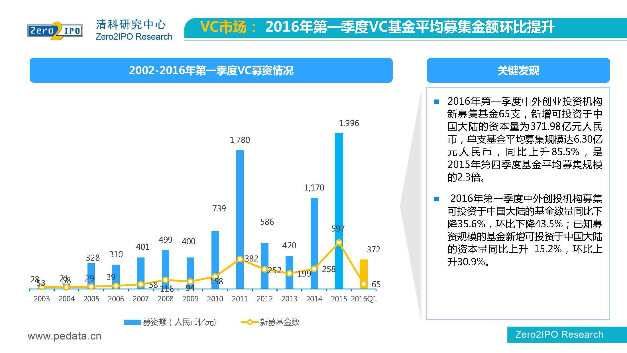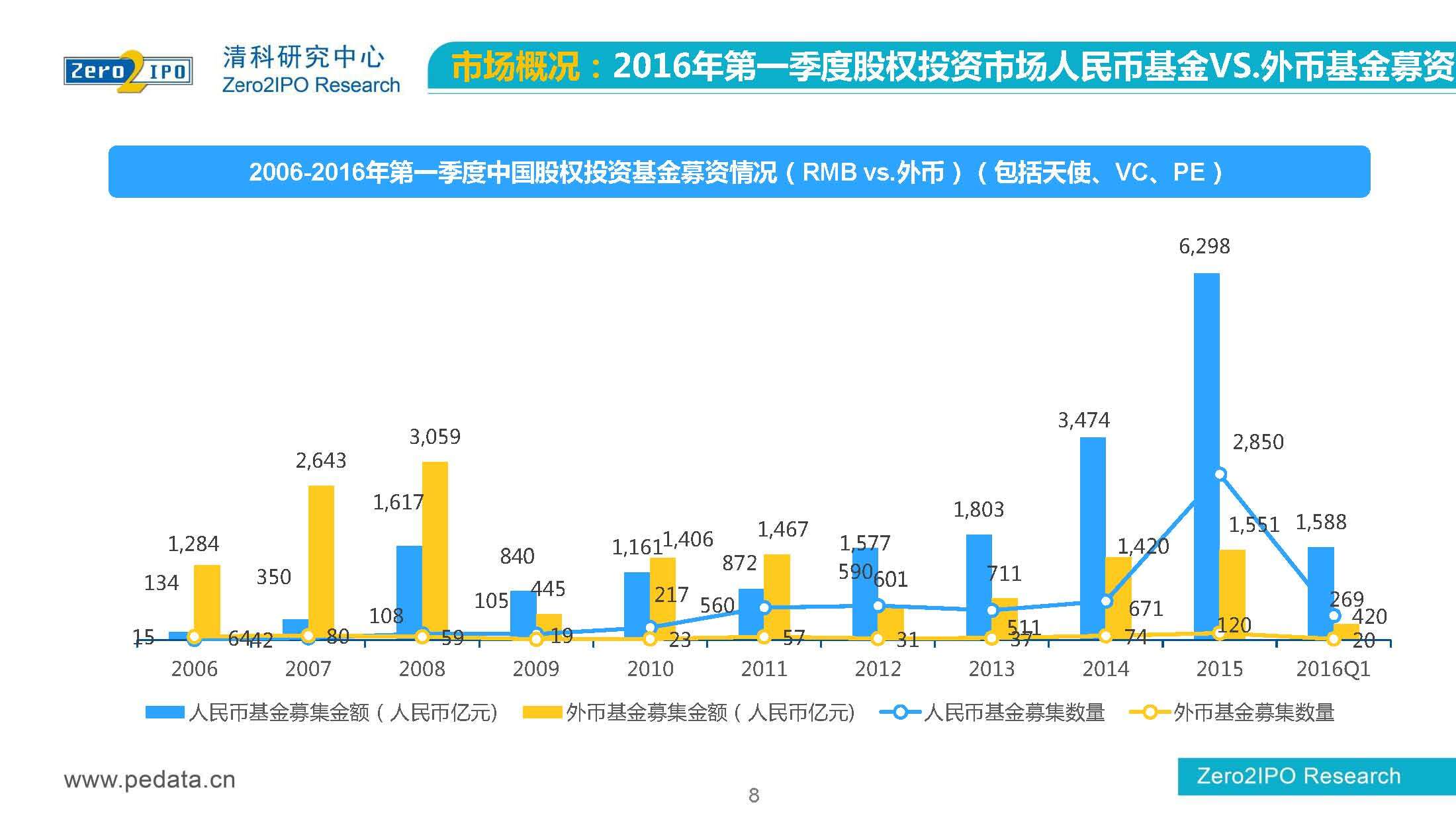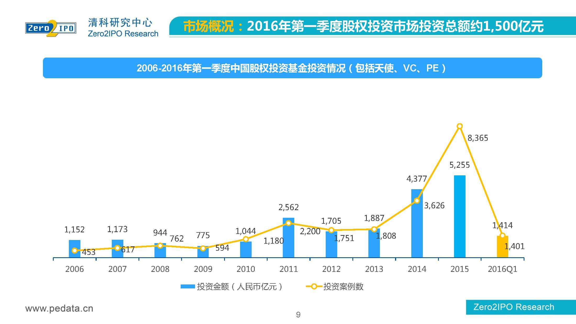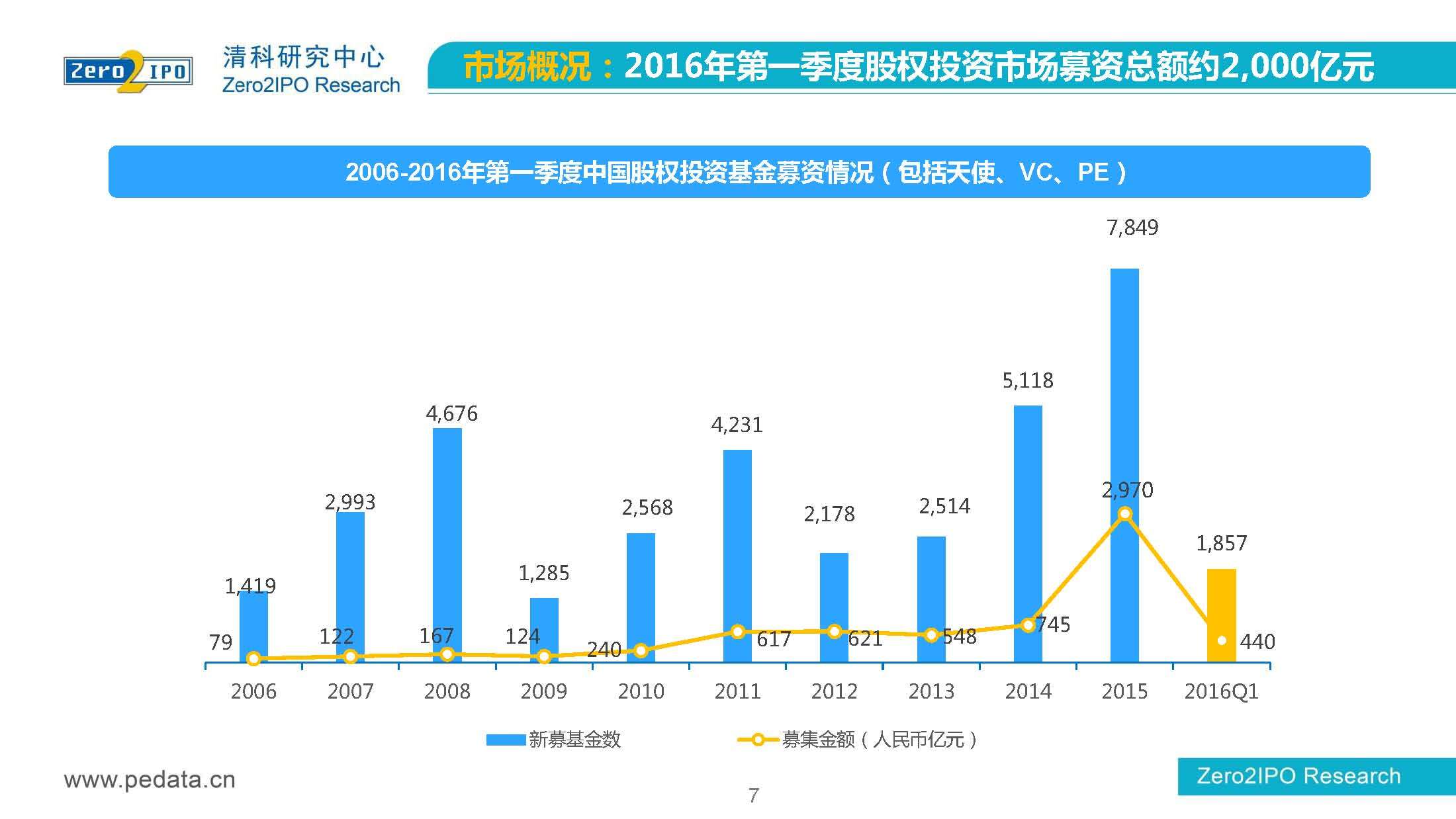 清科研究中心:2016年Q1中国股权投资市场回顾报告 根据清科集团旗下私募通统计显示,2016年第一季度股权投资市场募资总额约2,000亿元;股权投资市场投资总额约1,500亿元;中国股权投资行业走过20多个年头,市场管理资本量超5万亿,活跃机构超万家,中国新一轮股权投资时代到来 更多阅读:清科研究中心:2014年上半年中国股权投资市场回顾清科研究中心:2020年Q1中国股权投资市场回顾与展望清科研究中心:2019年中国股权投资市场回顾与展望清科研究中心:2022年上半年中国股权投资市场研究报告清科研究中心:2019股权投资金额下滑29.3%清科研究中心:2014年该13家众筹平台共发生融资事件9,088起 募集总金额13.81亿元人民币清科研究中心:2015年4月VC/PE市场募资金额16.84亿美元清科研究中心:2014年中国私募股权投资年度研究清科研究中心:2019年中国VC/PE项目退出收益研究清科研究中心:2017年投贷联动研究清科研究中心:2016年10月新三板统计报告清科研究中心:2016年上半年共有82家中国企业融资638.74亿元人民币清科研究中心:2016年6月中外创业投资及私募股权投资机构共募集金额54.84亿美元清科研究中心:2016年6月共发生投资案例312起 总投资金额达101.25亿美元清科研究中心:2015年7月VC/PE市场募资金额38.86亿美元