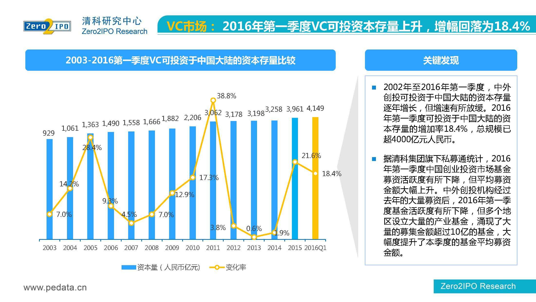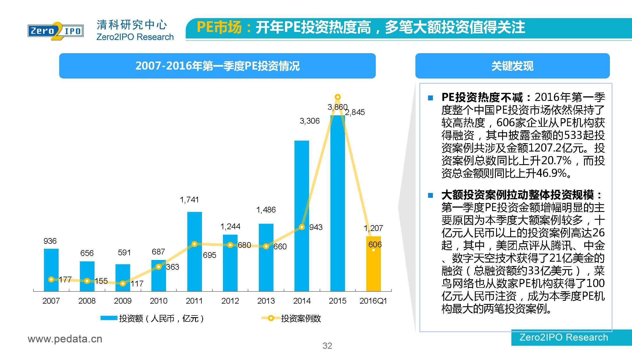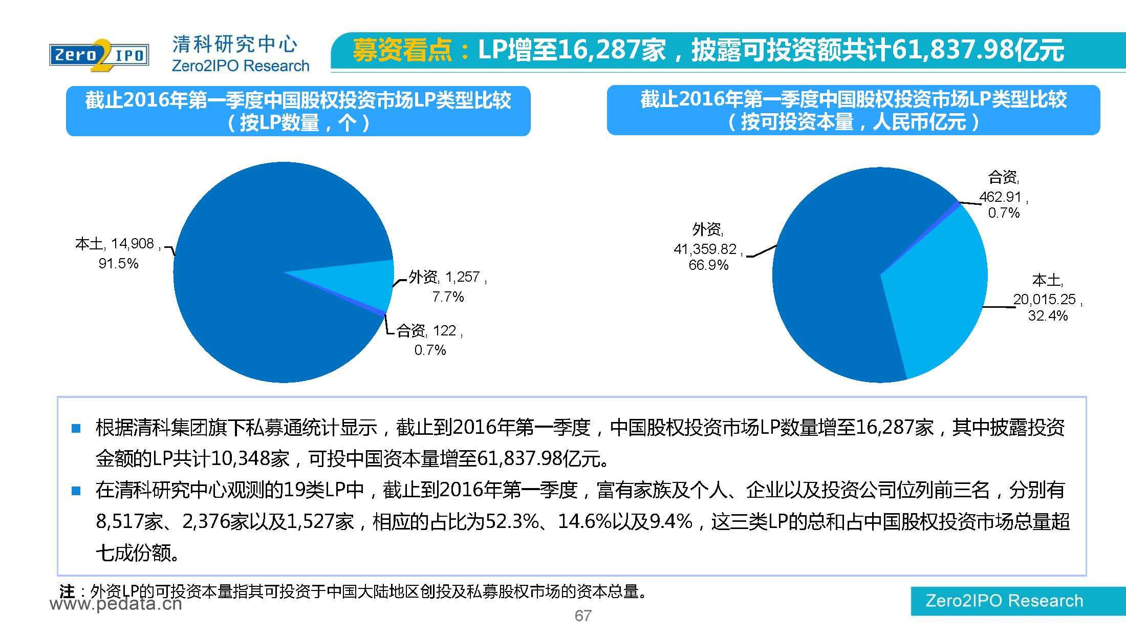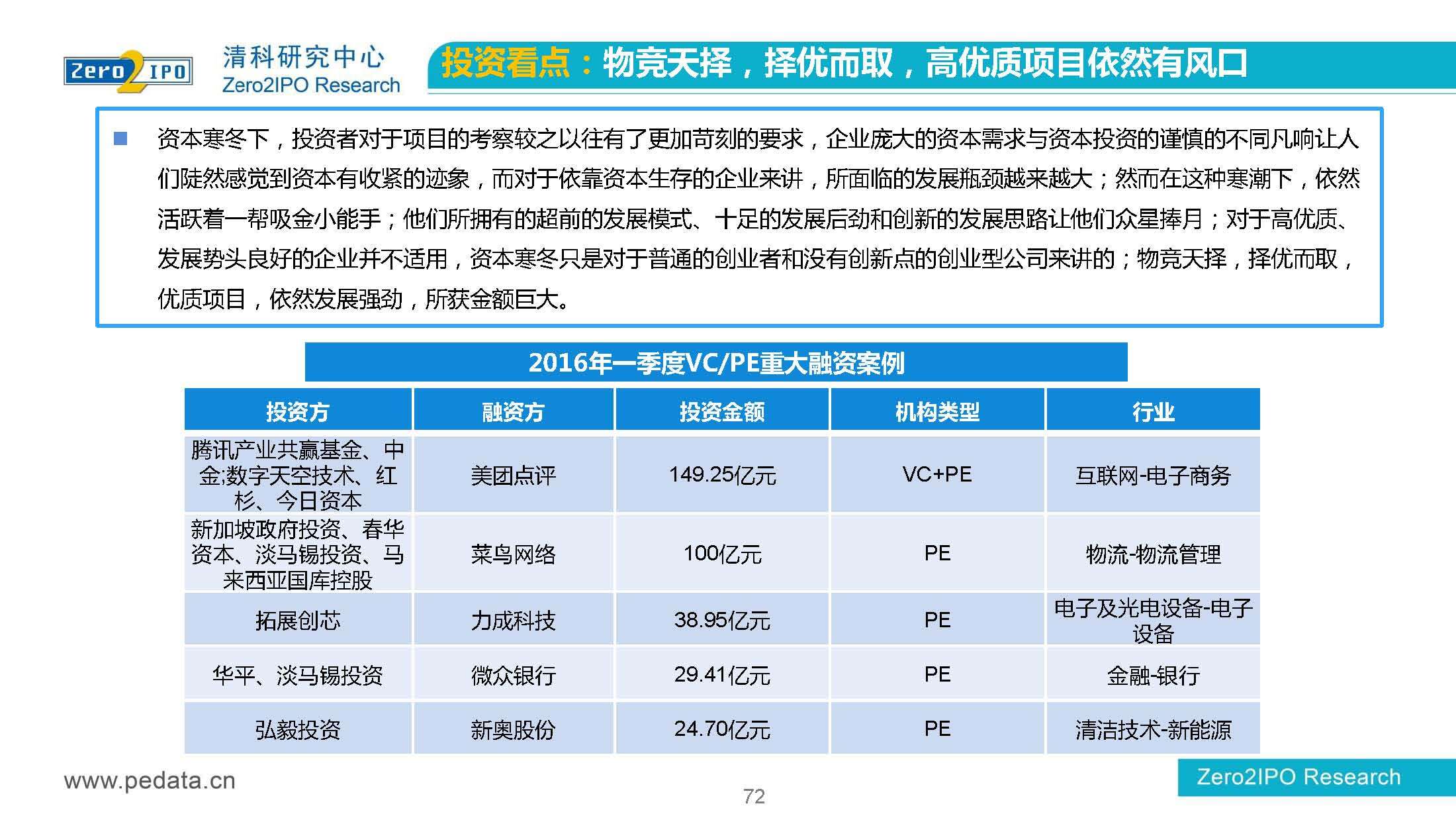 清科研究中心:2016年Q1中国股权投资市场回顾报告 根据清科集团旗下私募通统计显示,2016年第一季度股权投资市场募资总额约2,000亿元;股权投资市场投资总额约1,500亿元;中国股权投资行业走过20多个年头,市场管理资本量超5万亿,活跃机构超万家,中国新一轮股权投资时代到来 更多阅读:清科研究中心:2014年上半年中国股权投资市场回顾清科研究中心:2020年Q1中国股权投资市场回顾与展望清科研究中心:2019年中国股权投资市场回顾与展望清科研究中心:2022年上半年中国股权投资市场研究报告清科研究中心:2019股权投资金额下滑29.3%清科研究中心:2014年该13家众筹平台共发生融资事件9,088起 募集总金额13.81亿元人民币清科研究中心:2015年4月VC/PE市场募资金额16.84亿美元清科研究中心:2014年中国私募股权投资年度研究清科研究中心:2019年中国VC/PE项目退出收益研究清科研究中心:2017年投贷联动研究清科研究中心:2016年10月新三板统计报告清科研究中心:2016年上半年共有82家中国企业融资638.74亿元人民币清科研究中心:2016年6月中外创业投资及私募股权投资机构共募集金额54.84亿美元清科研究中心:2016年6月共发生投资案例312起 总投资金额达101.25亿美元清科研究中心:2015年7月VC/PE市场募资金额38.86亿美元