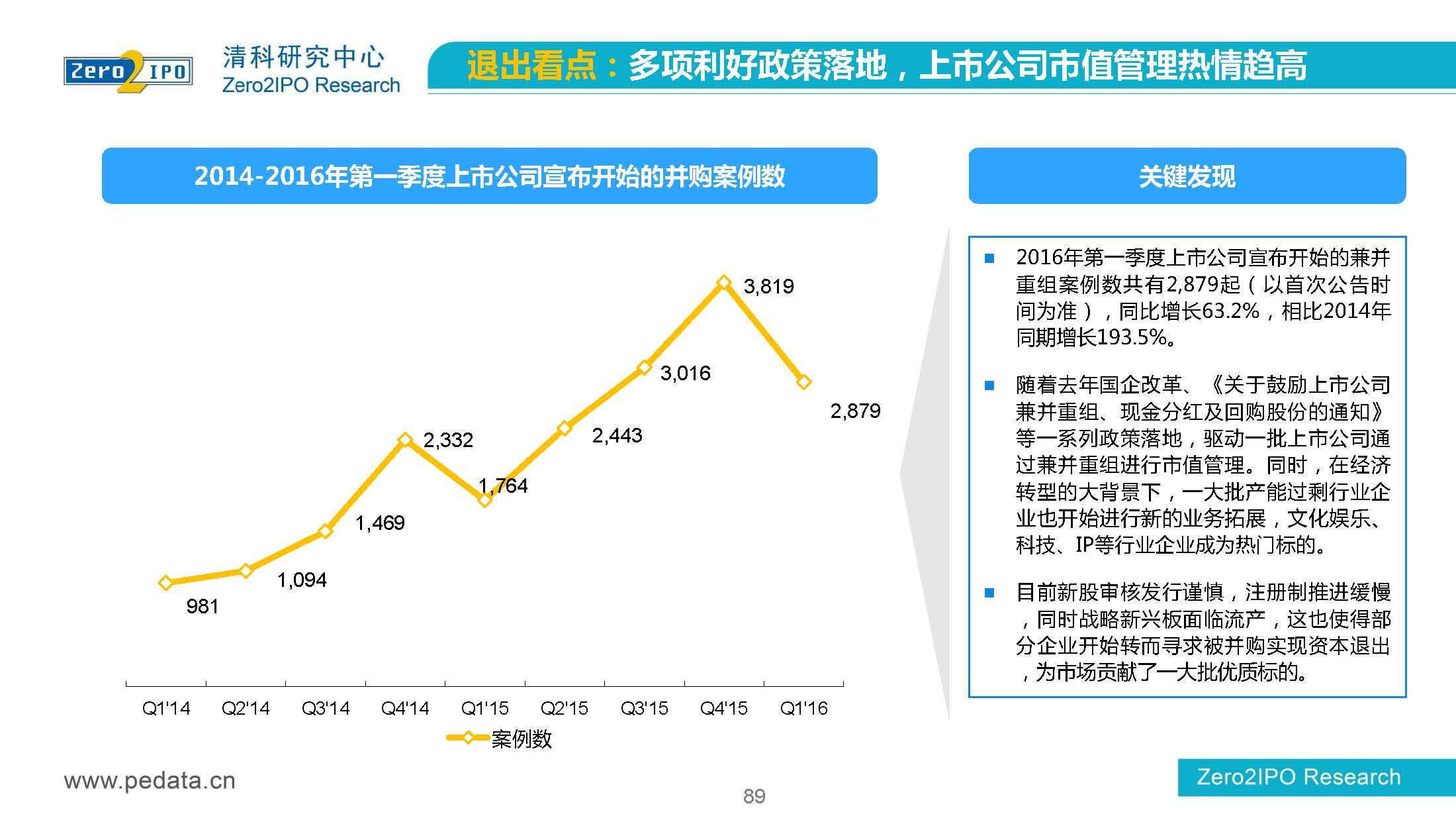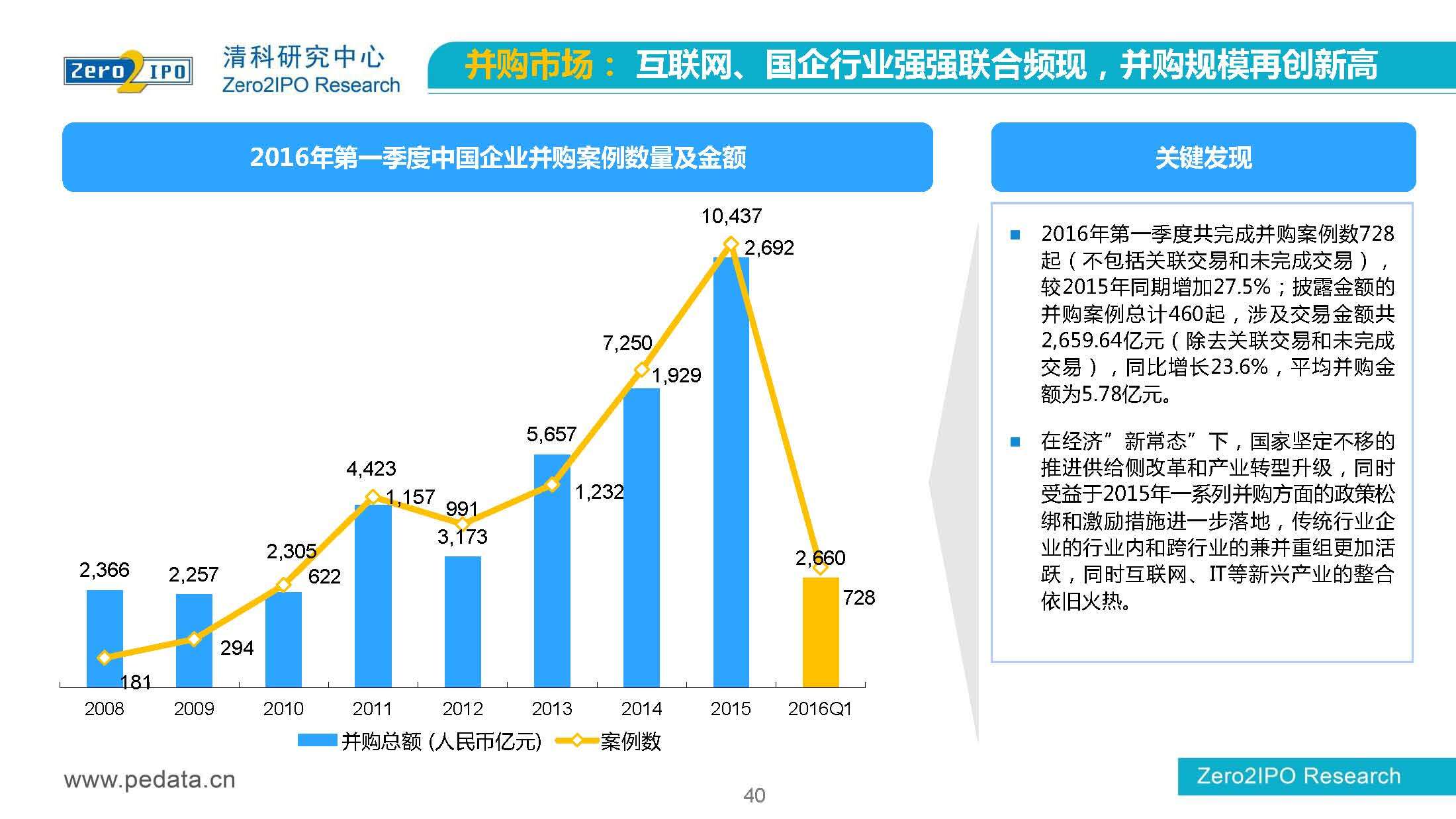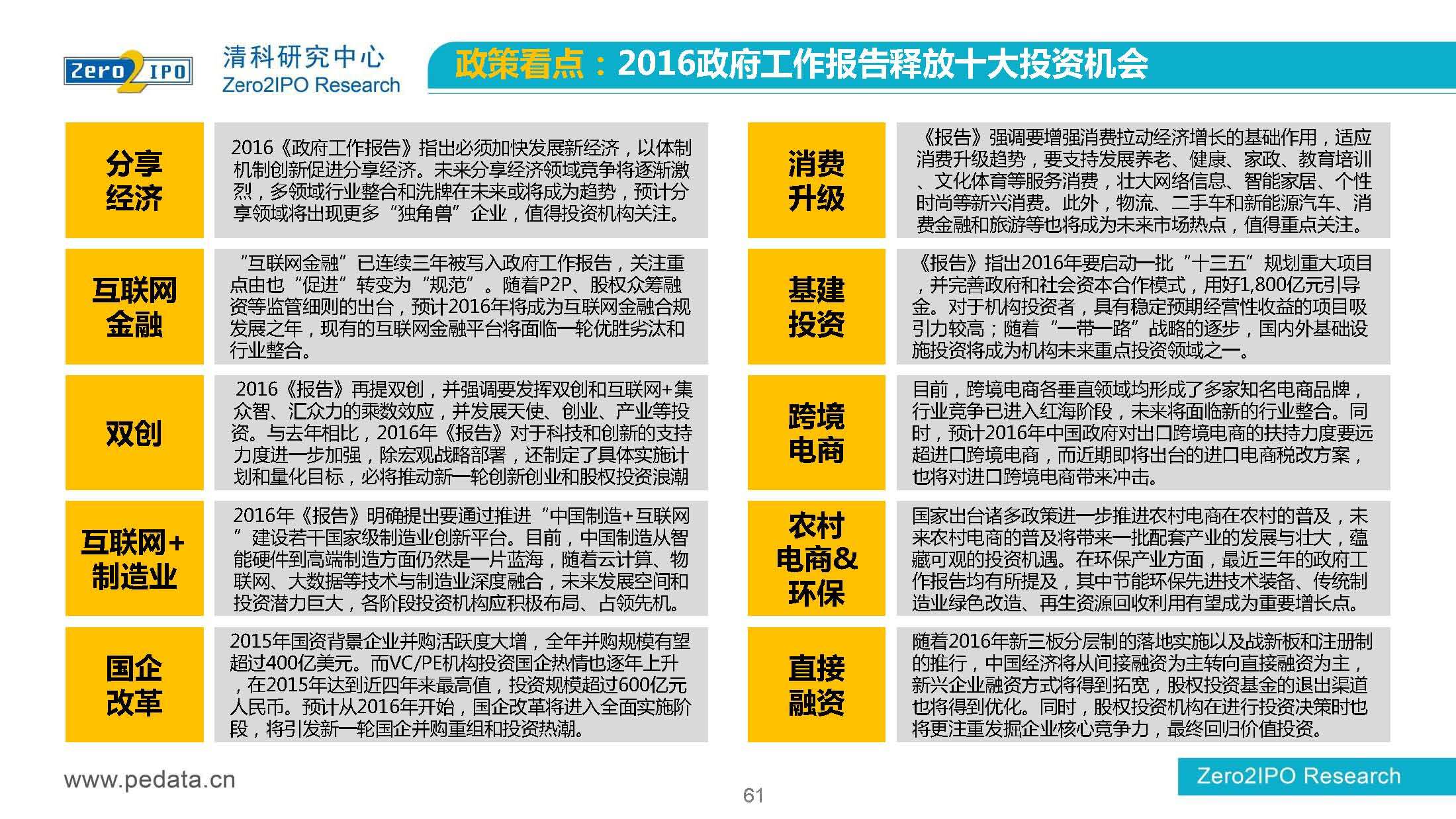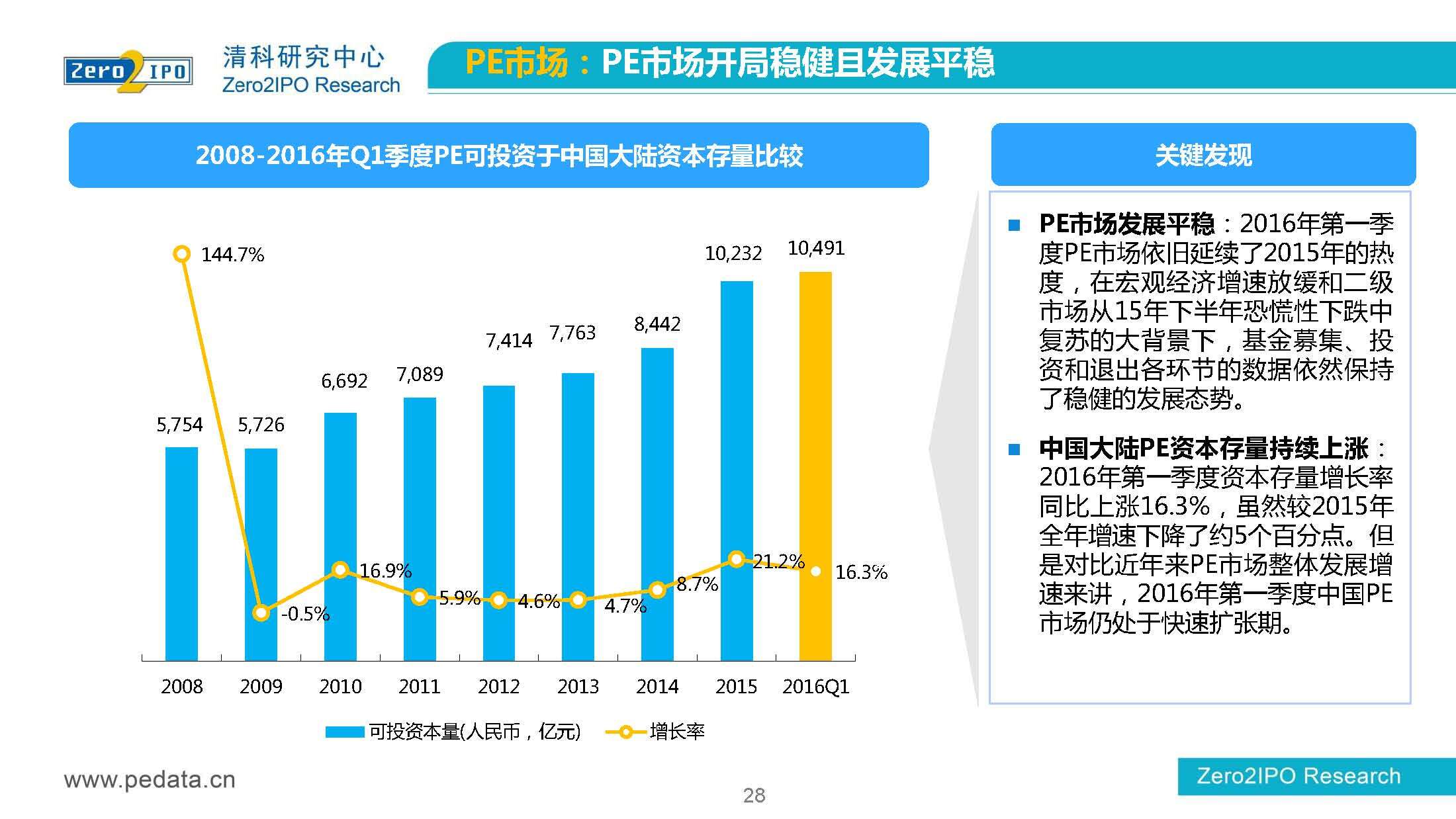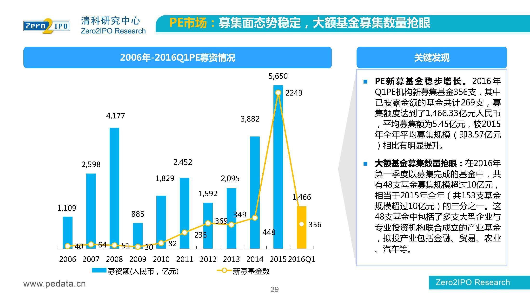 清科研究中心:2016年Q1中国股权投资市场回顾报告 根据清科集团旗下私募通统计显示,2016年第一季度股权投资市场募资总额约2,000亿元;股权投资市场投资总额约1,500亿元;中国股权投资行业走过20多个年头,市场管理资本量超5万亿,活跃机构超万家,中国新一轮股权投资时代到来 更多阅读:清科研究中心:2014年上半年中国股权投资市场回顾清科研究中心:2020年Q1中国股权投资市场回顾与展望清科研究中心:2019年中国股权投资市场回顾与展望清科研究中心:2022年上半年中国股权投资市场研究报告清科研究中心:2019股权投资金额下滑29.3%清科研究中心:2014年该13家众筹平台共发生融资事件9,088起 募集总金额13.81亿元人民币清科研究中心:2015年4月VC/PE市场募资金额16.84亿美元清科研究中心:2014年中国私募股权投资年度研究清科研究中心:2019年中国VC/PE项目退出收益研究清科研究中心:2017年投贷联动研究清科研究中心:2016年10月新三板统计报告清科研究中心:2016年上半年共有82家中国企业融资638.74亿元人民币清科研究中心:2016年6月中外创业投资及私募股权投资机构共募集金额54.84亿美元清科研究中心:2016年6月共发生投资案例312起 总投资金额达101.25亿美元清科研究中心:2015年7月VC/PE市场募资金额38.86亿美元