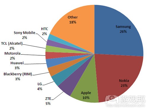 ABI Research:2012年Q1 三星占全球26%的移动市场份额 ABI Research今年第一季度报告显示,三星在最近十年来首次取代诺基亚,成为全球最大的移动设备制造商。 诺基亚目前占据全球23%的移动市场份额,落后于占比26%的三星,而苹果则以10%市场份额位列第三。 更多阅读:ABI Research:预计2012年全球4G智能手机和平板电脑销量达6100万台ABI Research:预计2012年手机平板出货将增加10倍ABI Research:2013年Q1全球平板电脑出货量约为3900多万台 近半收入来自美国ABI:RFID市场增长远低于预期ABI Research:预计2013年全球平板电脑出货量将达1.45亿台ABI Research:2012年全球移动设备摄像头出货10亿个ABI Research:2012年全球WiFi设备累计出货量将达50亿台ABI Research:预计2012年全球移动应用市场累计营收将突破300亿美元ABI Research:预计2012年底全球宽带用户数将达6.2亿ABI Research:数据显示iOS游戏平均大小达60MBABI Research:手机APP下载会持续增长吗?ABI Research:调查数据智能手机用户年均下载37个AppsABI Research:2012年智能手机配件营收将达200亿美元ABI Research:2012年Q1苹果iPad出货量达1180万台ABI Research:研究显示美国家庭电视机连网率仅27% 游戏机为80%