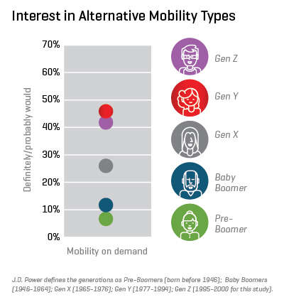 对于全自动无人驾驶技术,数据显示:同战前出生的年长一代(Pre-Boomers,1946年之前出生)和婴儿潮世代(Baby Boomer,1946年到1964年出生)相比,X世代(未知一代,1965-1976年出生)和Y世代(千禧世代,1977到1994年)的消费者以 及Z世代(网路世代,1995年-2000年)的汽车拥有者对完全自动无人驾驶技术显示出了相当大的信任程度。