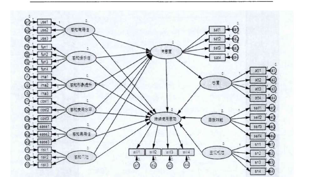 该模型的结构方程如图(具体方法请百度之)其中椭圆代表变量,箭头代表检验是否存在影响,之后涉及到模型的拟合程度验证和假设的验证。