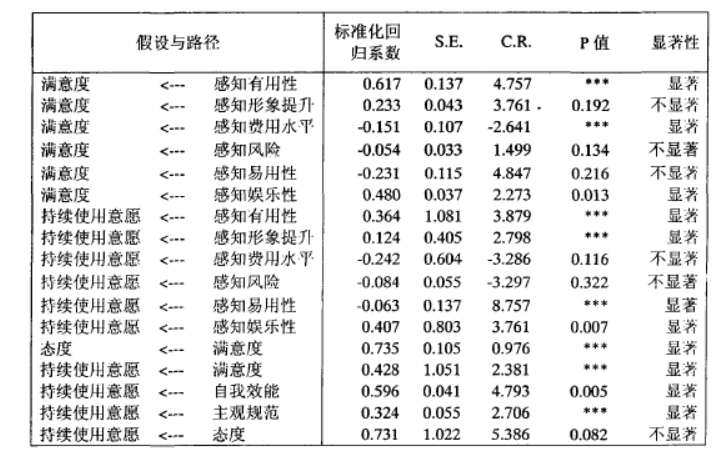 假设检验是重中之重,论文中的检验结果如图,主要关注最后的显著性,如第一条,满意度正向影响感知有用性的检验结果为显著,即这个假设在本次的问卷调查中得到了证实,他们之间具有显著的关系。而不显著的表示本次的问卷调查不能显著的判定两者之间有明显的关系,但也不能完全排除。