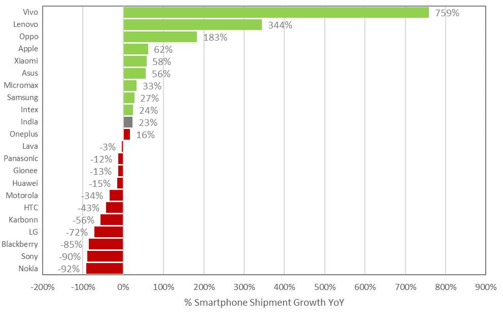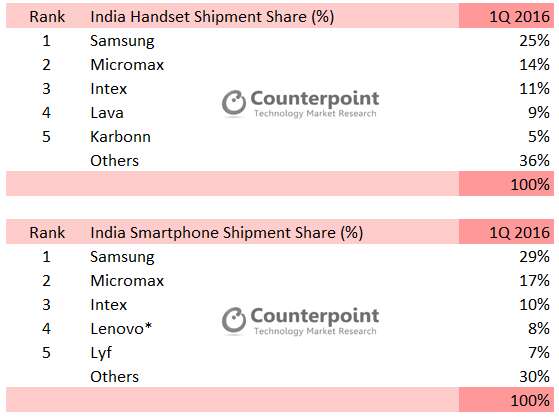 韩国的三星电子公司以29%的市场份额,出类拔萃地成为印度智能手机市场的第一大销售商。有趣的是,本季度才以“Lyf”品牌突然杀入该市场的Reliance Jio已经抢夺了7%的市场份额。在2016年第一季度,Lyf还超过Micromax和中国的联想集团而成为第二大LTE手机供应商。