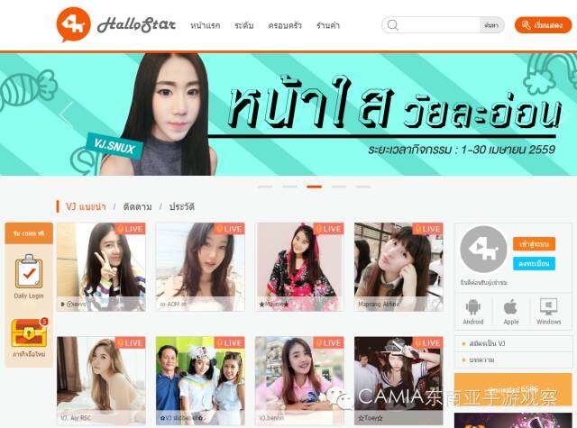 hallostar2014年进入泰国市场,最早网站名为halloshow。2015年3月,更名为hallostar。平台主页主要显示主播推荐、排行以及直播情况。内容多为美女娱乐直播、尽管也有小部分游戏玩家直播,但是资源很少。热门主播的粉丝数高达2-3万。其Facebook主页粉丝达12万, 每日更新频繁,多为DJ宣传推广。