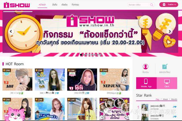 Ishow2015年进入泰国市场,比hallostar要晚。平台首页设置与hallostar出入不大。内容总体主打美女与搞笑,没有游戏直播分类。热门主播粉丝以千位计数。Facebook主页粉丝约3.4万,更新频繁,除了对DJ的宣传外,还包括一些线下线上活动的推广。