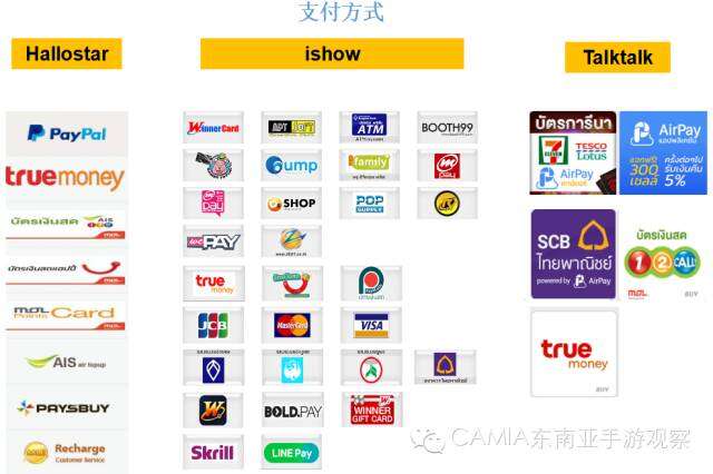 在支付上,TalkTalk仅依靠Garena自有支付平台即可。而上图中Ishow的各种支付渠道(点卡、信用卡、电子钱包等)都是通过winner online的支付平台实现的。至于hallostar, 很明显,接入的支付平台较为多样化~