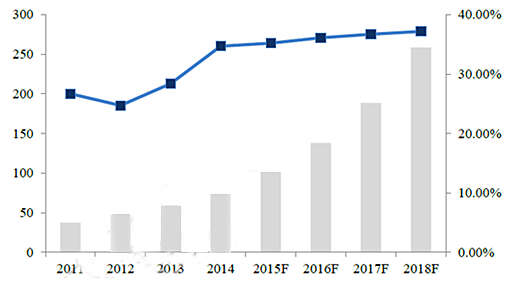 2015-2018 年中国大数据市场规模预测(单位:亿元)