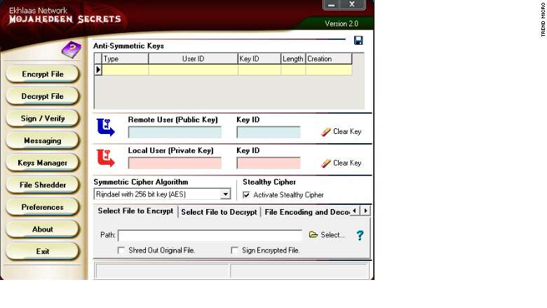 趋势科技公司还研究了恐怖分子自己开发的“定制”工具。一款名为Mojahedeen Secrets的工具能够加密电子邮件,2007年,其作为流行隐私软件PGP的替代品推出。这是首款特别为IS恐怖分子打造的专业软件,目前还不清楚开发者是何人。