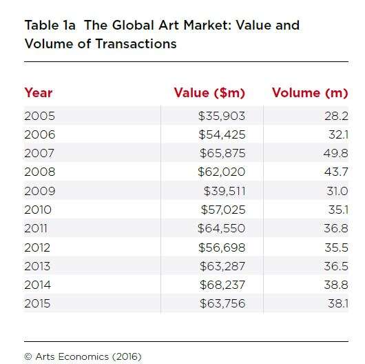 在2009年至2011年间,中国艺术市场经历了爆发式的增长,成为全球第一大艺术市场;但是在2012年,趋势发生了改变,中国艺术品市场销售额一年之间收紧了35%。2013年中国市场开始逐渐恢复,但是销售额增长速度明显放缓,几乎所有版块的艺术品买入都更加谨慎。然而,2015年的下滑比2012年更为严重,主要由美术品拍卖版块销售额的大幅度下跌导致。