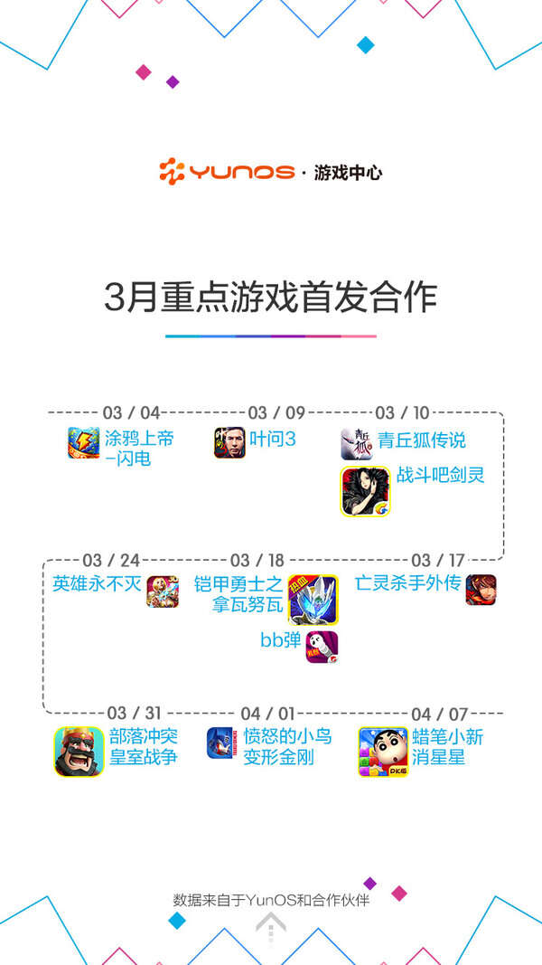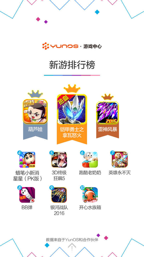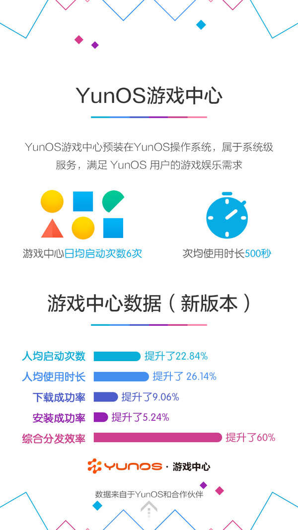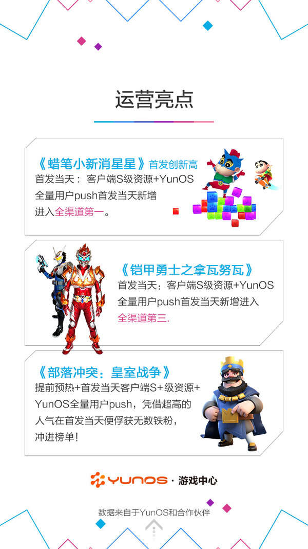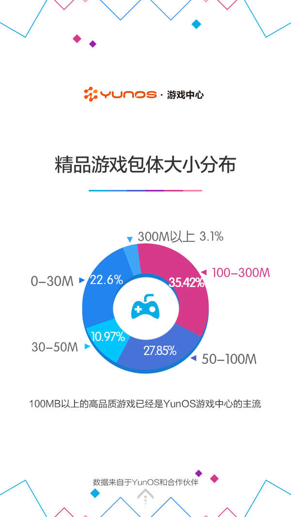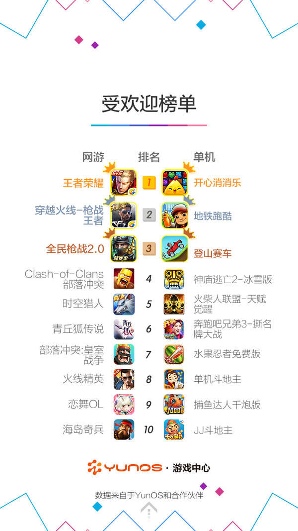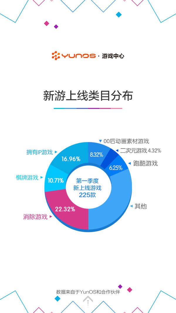 2016年Q1 YunOS游戏中心数据报告 YunOS游戏中心是YunOS系统精心为用户打造的,集休闲、竞技、资讯为一体的手机游戏平台。几年来,YunOS游戏中心不断推出新品游戏,持续为用户带来乐趣,并获得广大用户的充分认可。 截至今年2月底的时候,YunOS累计手机用户就已经超过了5000万,这些用户喜欢什么样的游戏呢?YunOS游戏中心又有哪些新品游戏首发呢?一起来看官方权威发布的《YunOS游戏中心2016年Q1数据报告》: 更多阅读:2015年天猫双11搭载阿里YunOS系统智能电视总销量超120000台2016上半年互联网公司风云榜美国亚马逊产品与市场研究软件工具迅雷声明:迅雷大数据公司与“迅雷”无关,提醒用户注意风险登顶APP Store免费排行榜 腾讯视频成暑期最热平台Instagram商业化新动作推三项工具爱尚鲜花挂牌新三板,自曝刷单26万笔,虚假收入累计三千万元数据看南京智慧旅游哈佛商业评论:认识情绪劳动在按需经济中的角色中电联:2021中国电力行业年度发展CCFA:2019年中国超市百强前程无忧:2021年Q1集成电路/半导体市场供需报告Demand Gen :制造商将数字转换扩展到销售和营销报告乐普医疗新冠病毒抗体胶体金法检测试剂盒、红外测温仪等产品已供往数十国家数字之旅的时代启幕——空间计算