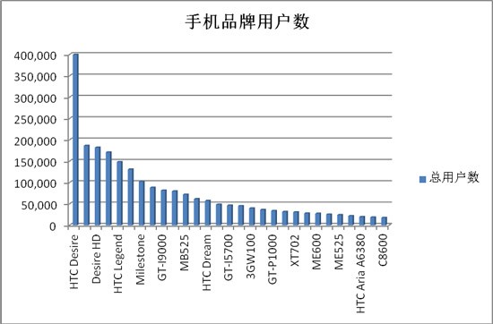 其中,HTC Desire占比13.14%、HTC Wildfire 6.13%、Desire HD 5.99%、HTC Hero 5.62%、HTC Legend 4.88%分别占据前五名,其中HTC占了其中之四,占有大部分市场份额,但总体来说,Android系统智能手机使用趋势呈上升趋势。