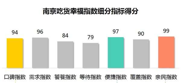 例如,在南京,衡量餐厅评价的口碑指数为94,餐厅质量整体较高;衡量美食需求的需求指数为96,城市居民的美食需求比其他城市更加旺盛;衡量开通团购、外卖等在线业务商户比例的便捷指数为97,显示出餐饮业在线化程度高,与北京、上海等互联网发达的一线城市相仿;吃货成本低,按照2015年城镇居民可支配收入计算可外出就餐超过1000次,仅次于同省的苏州。