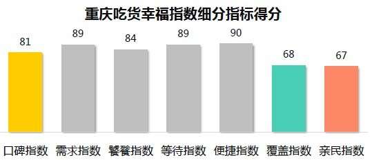 2015年城镇居民可支配收入计算,重庆吃货可外出就餐约550次,约为南京的1/2;从来源于人均餐厅拥有量的覆盖指数来看,虽然重庆餐饮业发达,但由于重庆人口数量位列全国城市之首——常住人口超过3000万——导致每万人餐厅拥有量低于全国平均。此外,重庆的口碑指数为81,也远低于南京的口碑指数94。报告分析认为,重庆以川菜为核心,菜系分类中火锅占20%,川菜占20%,另外加上特色小吃,留给其他菜系的空间有限,菜系的单一化发展限制了更多元化的吃货需求;同时,川菜本身就是用户评价的洼地,重视口感的本地菜系在整体服务品质上的投入不足,导致整体餐饮口碑略低。其他传统菜系及海外菜系的商户比例较低,川湘菜更注重口感,且本地商户中服务品质投入不足,导致用户评价较低。