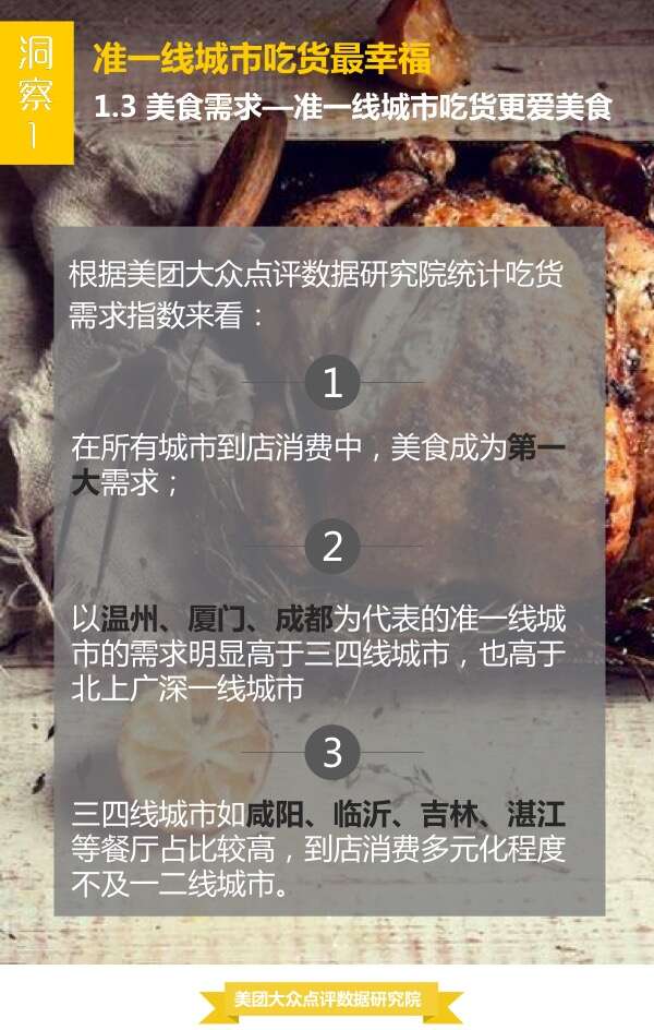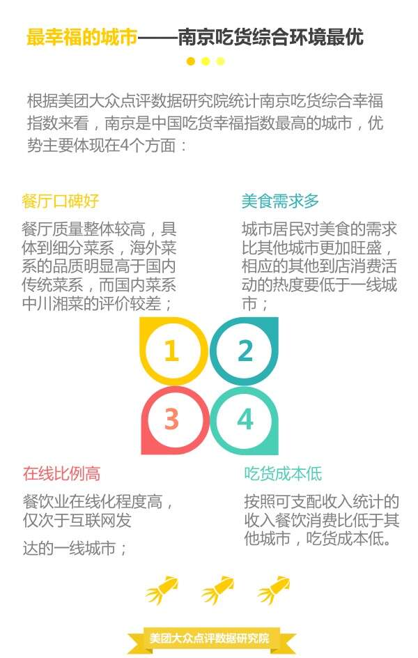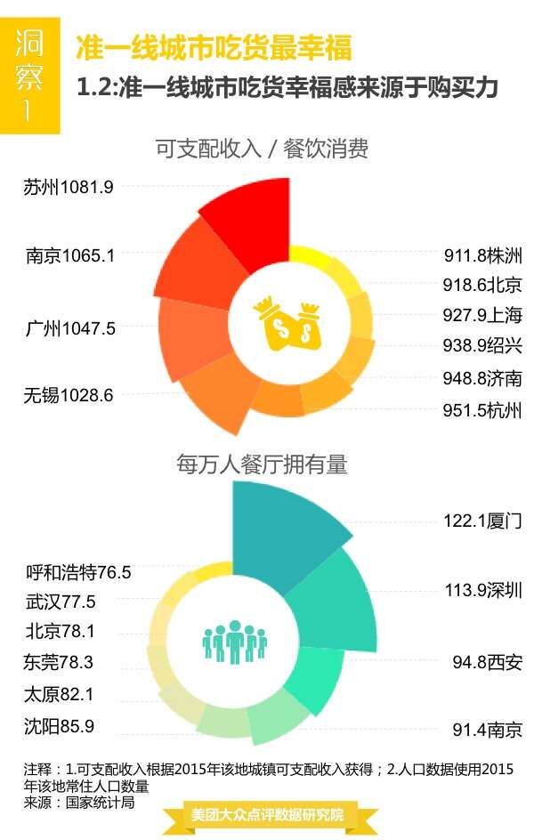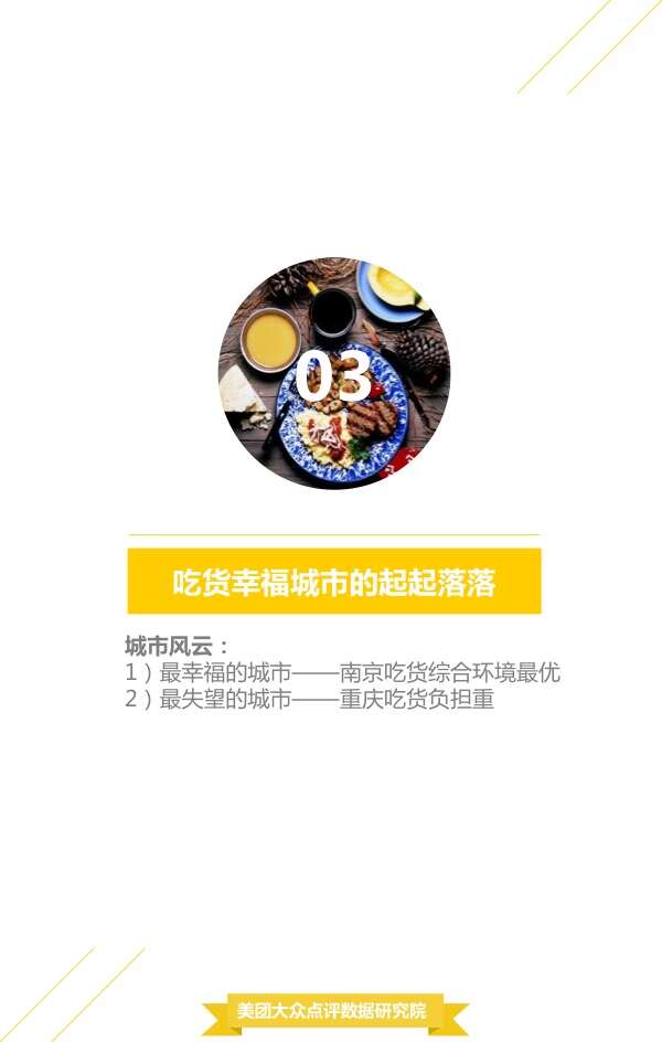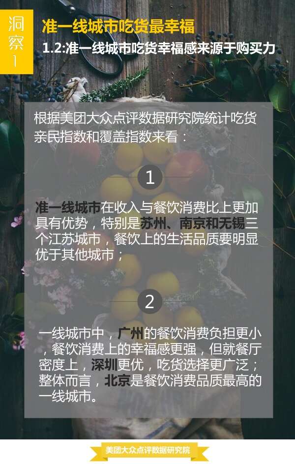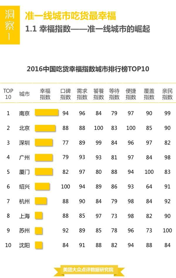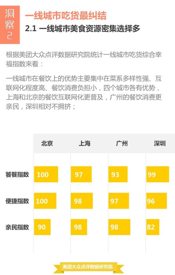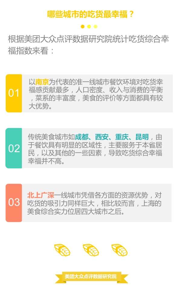 基于美团大众点评13年来积累的海量数据挖掘,《2016中国吃货幸福指数大数据报告》全面分析指出中国城市餐饮格局的变化趋势:以南京为首的准一线城市餐饮综合实力强,作为吃货幸福城市正在崛起;以重庆为代表的部分传统美食城市餐饮品类守旧,收入与消费价格不平衡,失守吃货幸福城市城池;京沪广深菜系丰富,一线城市依然是吃货幸福城市的代表中坚。同时,以预订、外卖、团购为代表的餐饮O2O化提高了城市吃货的幸福感,让餐饮消费更平等。