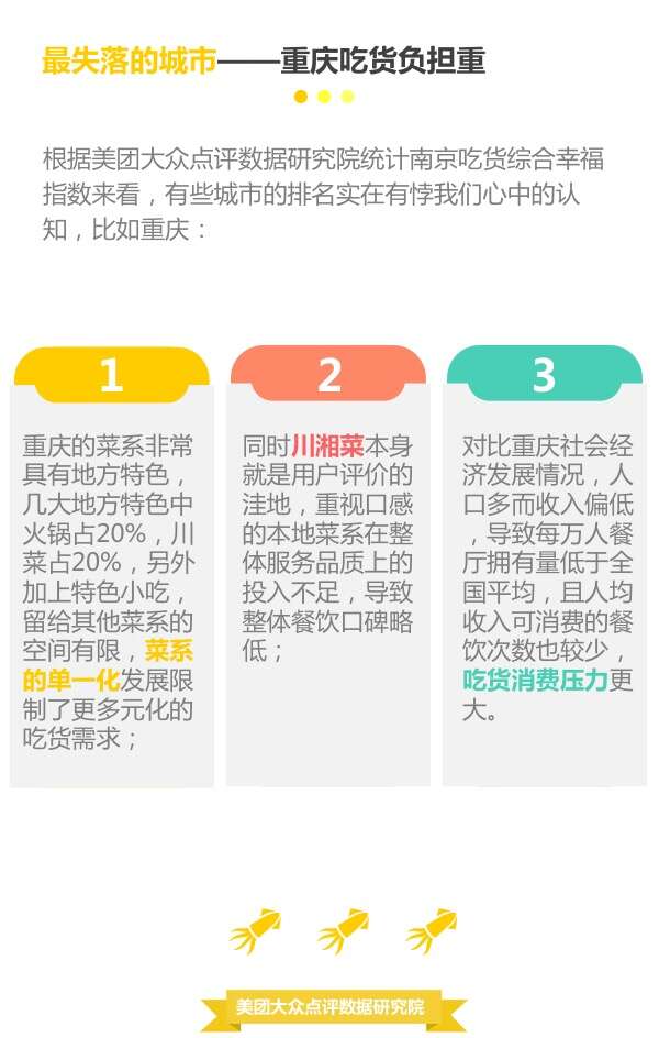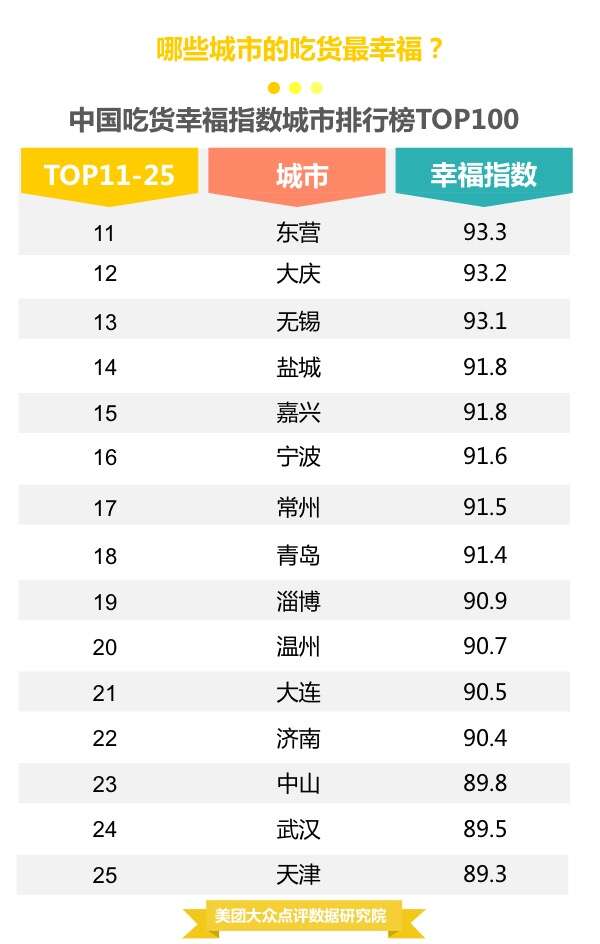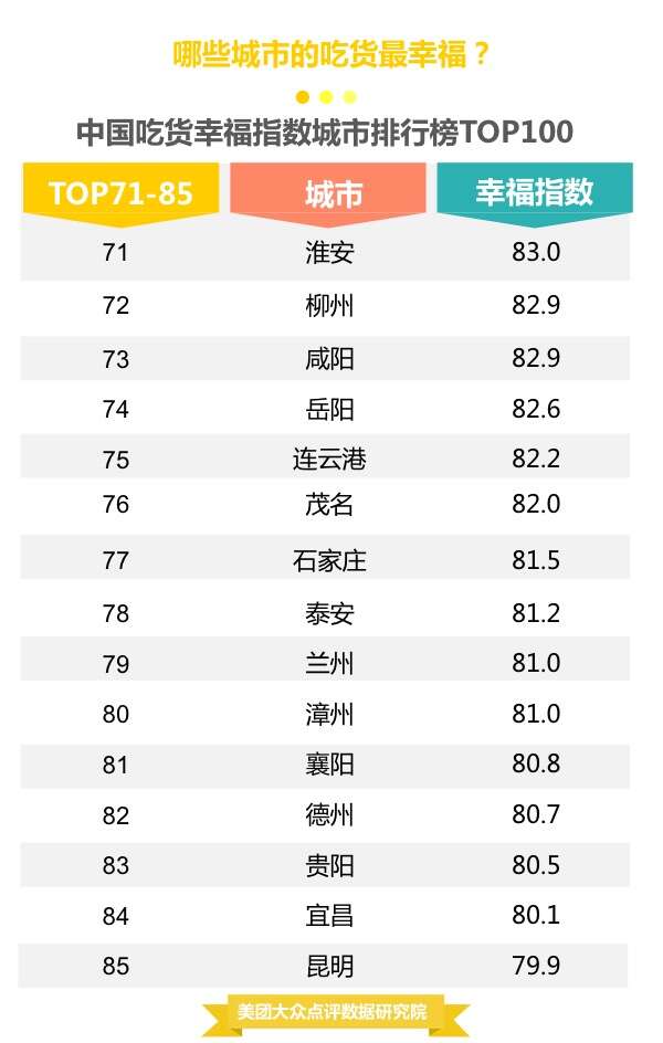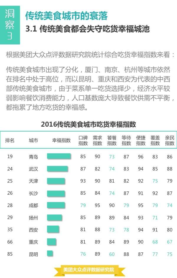 根据美团大众点评数据研究院统计综合吃货幸福指数来看,重庆、成都、西安等传统美食城市排名分别为66名、28名和35名,均未进入吃货幸福城市十强,着实令人意外。