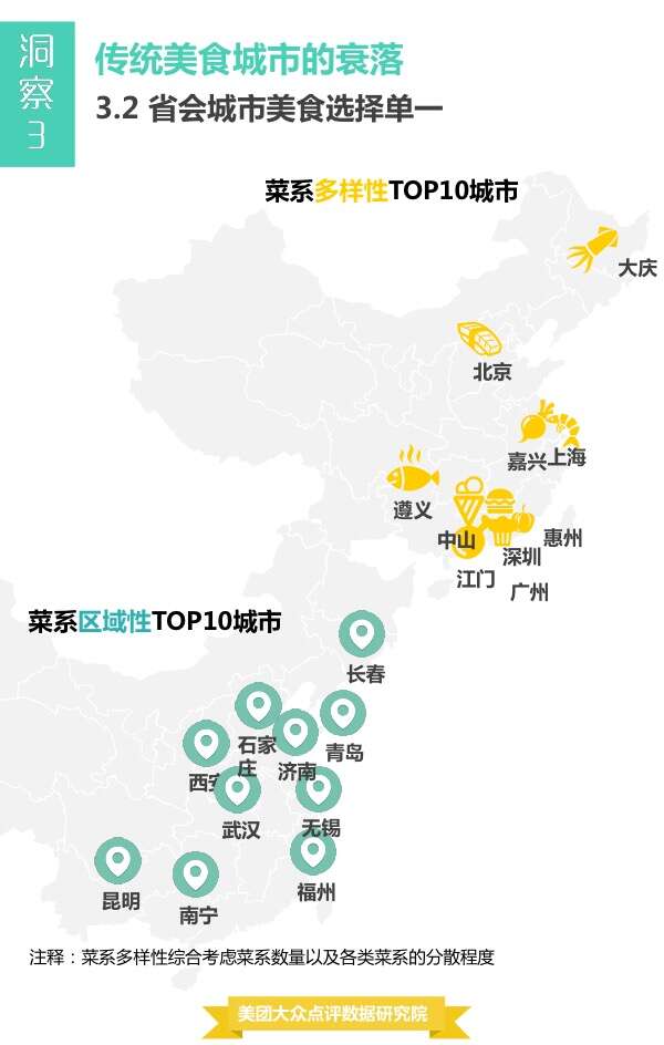 报告认为,这些城市由于菜系单一吃货选择少,经济水平较弱影响餐饮消费能力,人口基数庞大导致餐饮供需不平衡,都拖累了地方吃货的幸福感。
