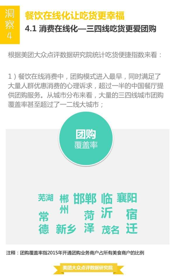 在消费升级的大背景下,餐饮消费与服务在线化趋势明显。报告指出,三四线吃货更爱团购,一二线城市更爱预订外卖。
