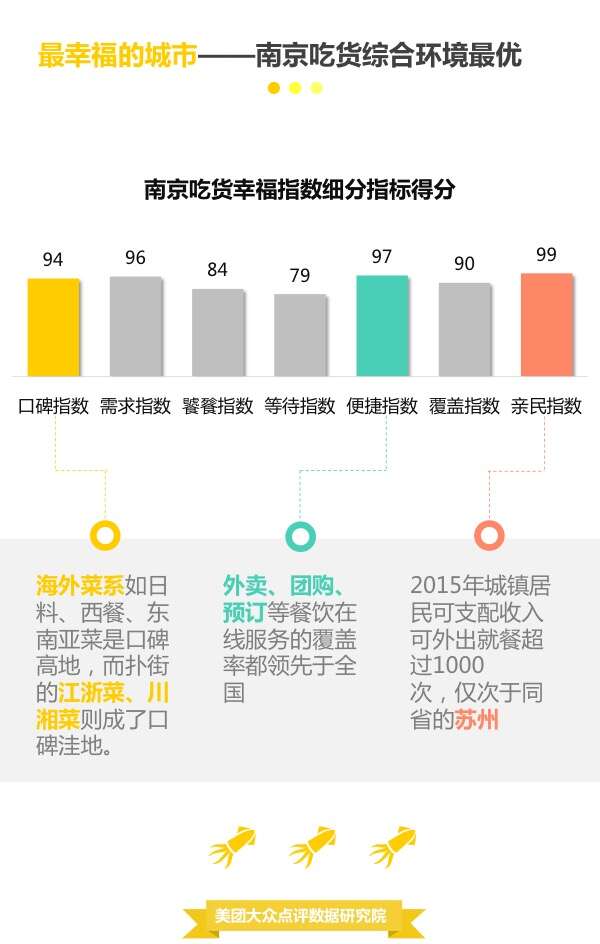 2016中国吃货幸福指数大数据报告》的冠军城市南京为例,可以看出南京在收入与消费的平衡、菜系的丰富度、美食评价、美食需求等方面都具有较大优势。