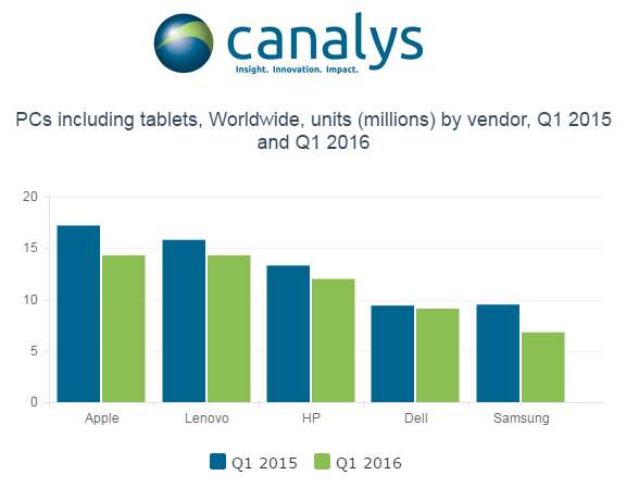 Canalys指出,一季度所有公司、所有细分市场的表现都不好,但随着消费者对平板笔记本2合1设备(变形本)的钟爱,2合1设备销量同比增长了13%,不过这并不能抵消平板电脑市场的滑坡。2016年一季度平板电脑出货量近3900万台,同比下降15%。