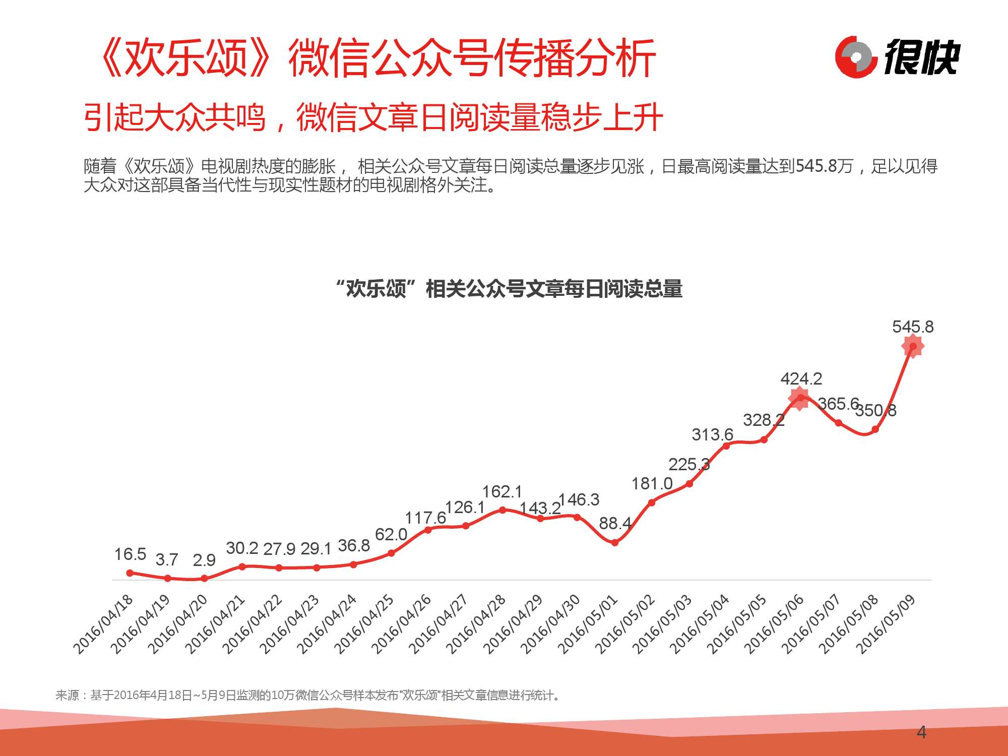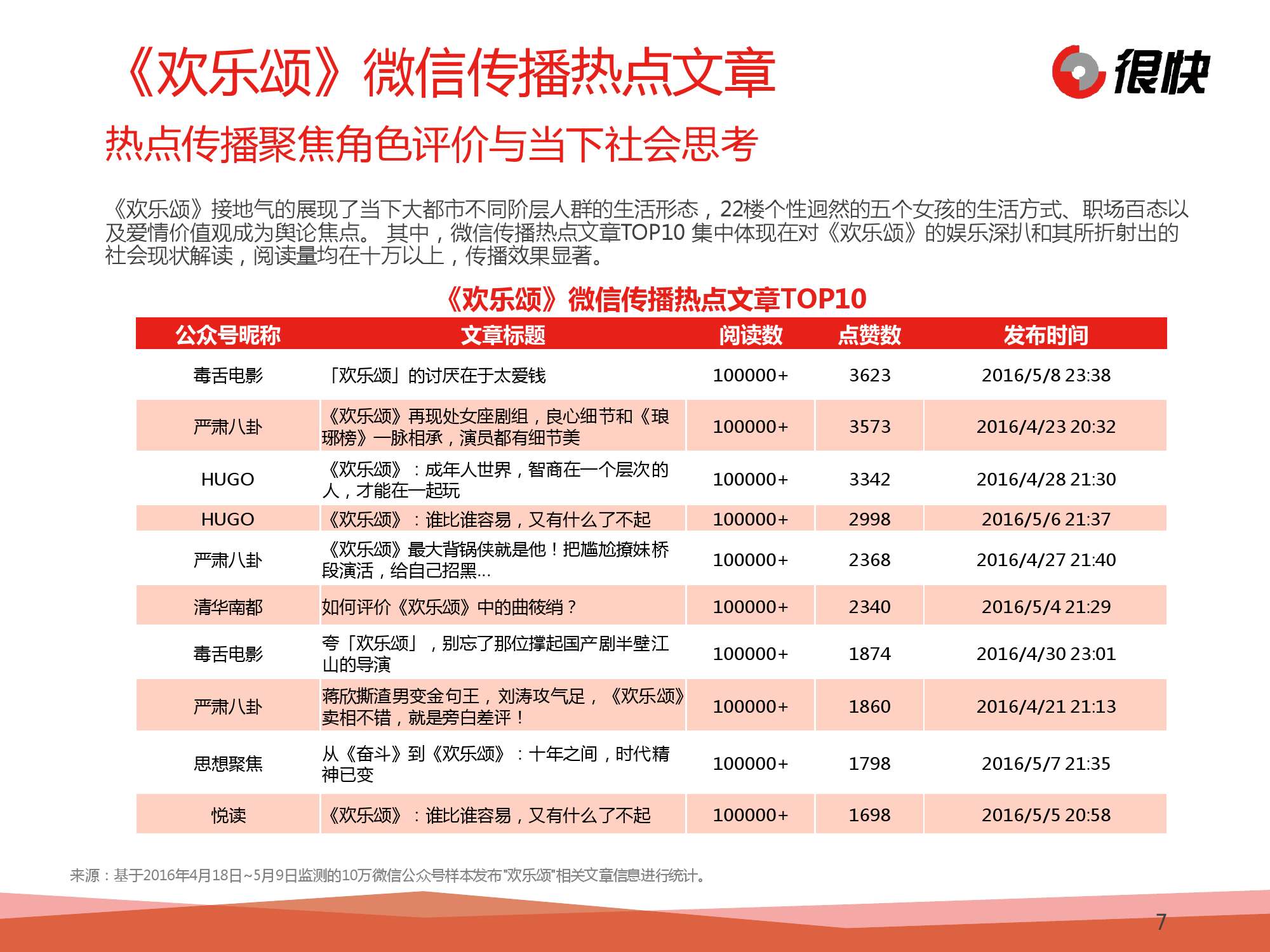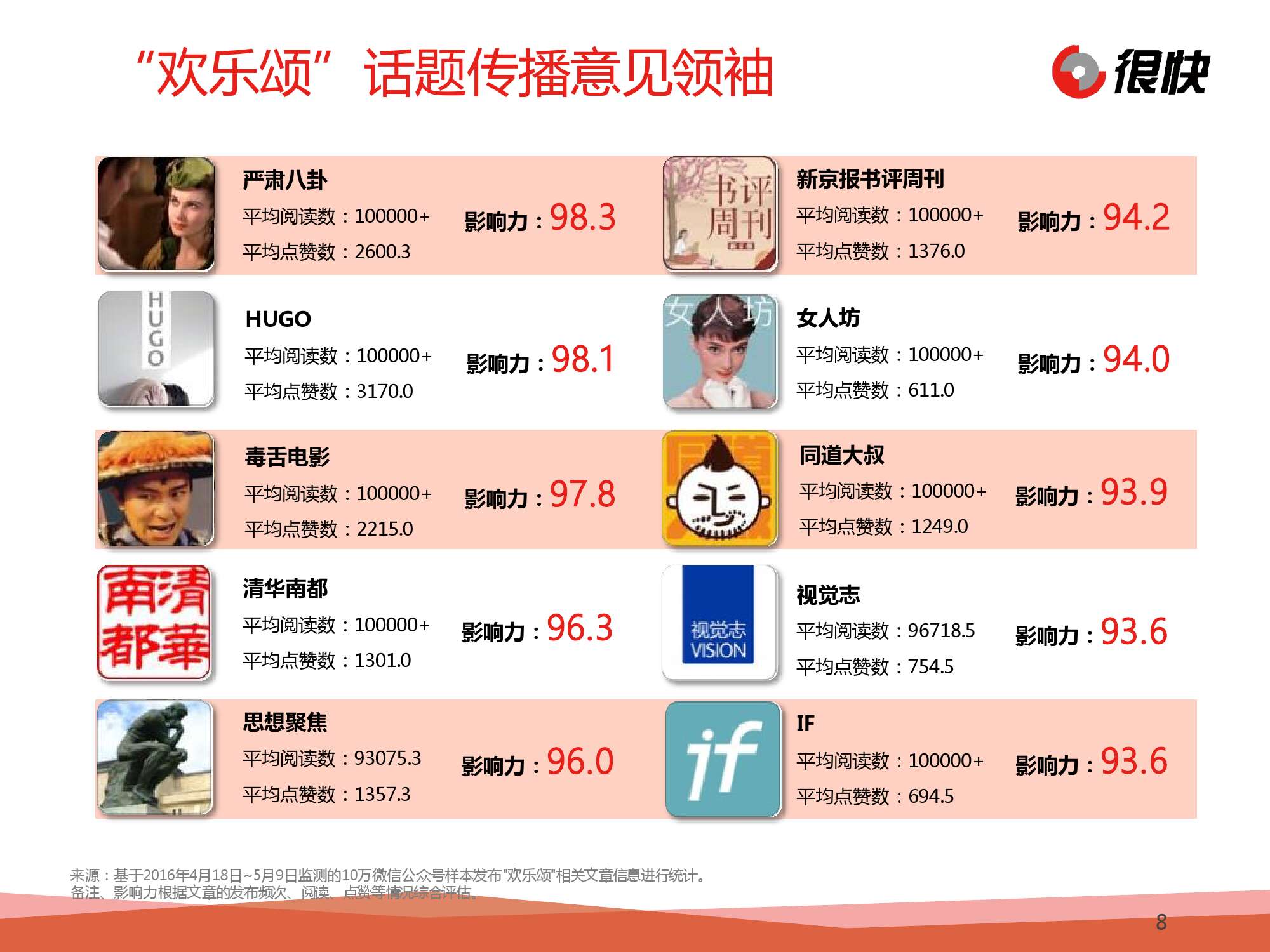 Henkuai:2016年5月《欢乐颂》微信公众号热点洞察 更多阅读:Henkuai:2016年中国汽车后市场微信公众号数据洞察报告很快:2016年1月中国母婴行业公众号数据洞察Henkuai:2016年中国春节旅游公众号数据洞察报告Henkuai:2016年1月中国医疗健康行业公众号数据洞察BlueView:2016年4月汽车品牌微信公众号洞察–信息图很快:2016年海淘新规微信公众号数据洞察报告2015年微信公众号用户行为习惯研究CCFA:2019年中国超市百强中国消协:2024年挽回经济损失12.8亿元 投诉解决率68.75%网站分析图书:网站分析基础教程:流量与价值的秘密 [平装]TIOBE:2013年4月编程语言排行榜:Objective-C跌出前三eMarketer:2011年澳大利亚B2C市场销售规模达105亿美元财政部:2019年11月份全国彩票销售情况Sensor Tower:2022 年 11 月全球热门移动游戏收入TOP10 腾讯《王者荣耀》吸金超 2 亿美元蝉联冠军第二届智能车载光峰会举行:光智交融,助力智能汽车产业繁荣发展