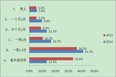(一)用户使用移动支付的频率进一步提高。2015年,有33.6%的用户每天使用移动支付,有36.5%的用户一周使用2-3次移动支付,有10.3%的用户每周使用1次移动支付,三者合计为80.4%,高于2014年的71.3%。