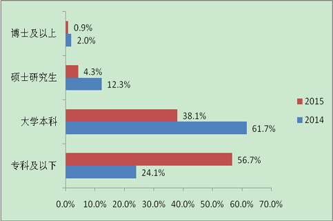 (二)专科及以下学历用户在移动支付用户中占比增加。2015年,大专及以下学历的移动支付用户排名第一,占比为56.7%;大学本科学历用户列第二,占比为38.1%;硕士研究生学历用户列第三,占比为4.3%;博士及以上高学历用户占比0.9%。整体来看,专科及以下学历用户占比有明显增加,比2014年的24.1%增加32.6个百分点。