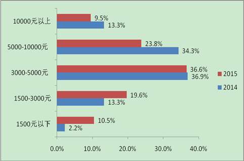 (三)低收入移动支付用户占比增加。2015年,移动支付用户个人月收入在3000-5000元水平的人数最多,占比为36.6%;5000-10000元水平的用户列第二,占比为23.8%;1500-3000元水平的用户列第三,占比为19.6%;1500元以下水平的用户列第四,占比为10.5%;10000元以上水平用户列第五,占比为9.5%。与2014年相比,3000元以下的用户占比显著增加,上升14.6个百分点。