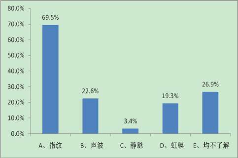 (一)用户对生物识别技术应用于移动支付的总体认知度不高,仅对指纹支付较为熟悉。69.5%的用户了解指纹支付,22.6%和19.3%的用户了解声波支付和虹膜支付,仅有3.4%的用户了解静脉支付,对所有生物识别技术均不了解的占比为26.9%。