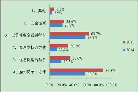 (五)用户通过与支付账户绑定,登录支付账户直接选择银行卡完成支付占比显著升高。2015年,有64.6%的用户愿意通过与支付账户绑定,登录支付账户直接选择银行卡完成支付;有14.3%的用户愿意每次输入银行卡卡号、密码等要素进行支付;35.5%的用户表示以上这两种方式都可以接受。