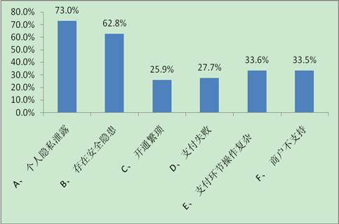 (七)安全隐患和支付环节操作复杂是用户最担心的问题。在调查中,安全隐患和支付环节操作复杂是移动支付用户最担心的问题,分别占比为70.6%和42.8%;列第三的是限额低,占比为27.7%;列第四是手机网速慢,占比为23.8%;用户担心程度较少的问题是支付功能开通流程繁琐,占比为12.6%。