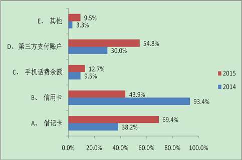 (四)借记卡、支付账户和信用卡是用户最常使用的支付工具和账户。2015年,有69.4%的用户使用借记卡进行移动支付列第一,使用支付账户进行移动支付的用户列第二,占比为54.8%;使用信用卡进行移动支付的用户列第三,占比为43.9%;使用手机话费余额进行移动支付的用户列第四,占比为12.7%。