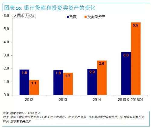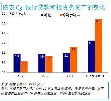 对非银行金融机构的信用扩张更多采用的是投资而非贷款的形式。除四大行外的其它12家A股上市银行,其投资类资产在2015年和2016Q1期间增加了5.5万亿元人民币,远远的大于同期3.3万亿元人民币的净新增贷款(图C3)。这些投资类资产透明度较低,因而可能比贷款的潜在风险更大。