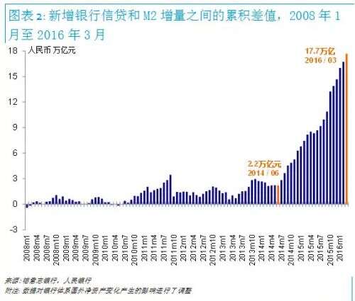 另一种观察这两个指标差距的视角是研究它们人民币量值之间而非同比增长速度之间的差值。在2014年7月和2016年3月间,中国银行的信贷总额增加了41万亿元。在调整了同期银行系统国外净资产下降1.7万亿元的影响后,它比同期23.7万亿元M2的扩张累计高出15.5万亿元 。这一累计差额相当于中国2015年国内生产总值的23%(图2)。