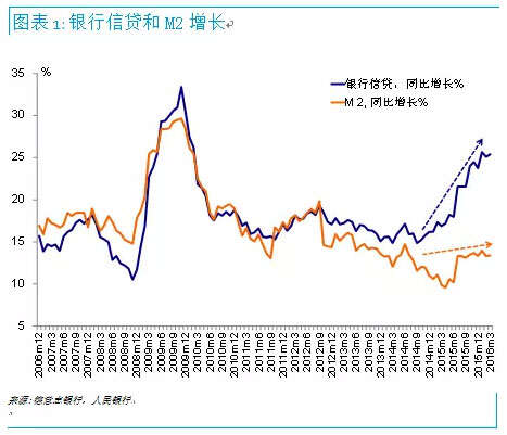 中国的银行信贷增长和M2增速曾一度保持同步。这不难理解,因为如果银行的主要业务是将存款转发为贷款,这两个指标的相关性应该很高。但是近年情况发生变化。银行信贷的同比增速已经从2014年下半年的15%提升至2016年三月底的25.4%(图1)。M2增速在2015年中政策宽松后逐步提升,但在2016年三月底也仅为13.5%。这两个增速之间的差值从2015年6月的7.8%扩大到2016年3月的12%。