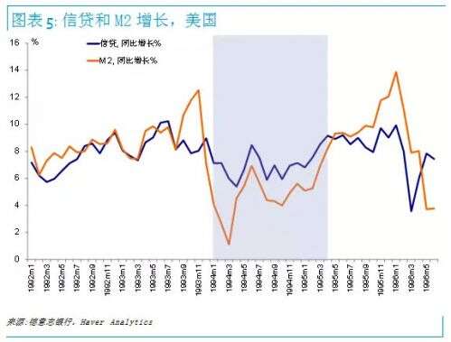 在美国次贷危机之前也出现了类似的情形,但整体情况不如亚洲金融危机时明朗。信贷增速在2002和2005年间持续高于M2增速,但在2006年年初缩小(图5)。由于数据的限制,我们无法深入研究20世纪80年代日本的经验。
