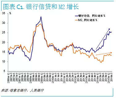 银行信贷和M2增速2015年以前一直比较接近,自15年以来两者之间的差额迅速扩大(图C1)。这表明目前通过信贷扩张来刺激经济的政策并未完全转化为对企业和家庭的贷款。在2015年,银行对非银行金融机构的信贷同比增长了53.5%,而在2016年第一季度,这一增速更达到68.3%;与此同时,银行对政府、企业和家庭住户的信贷在这两个时段仅增长了20.0%和19.5%(图C2)。
