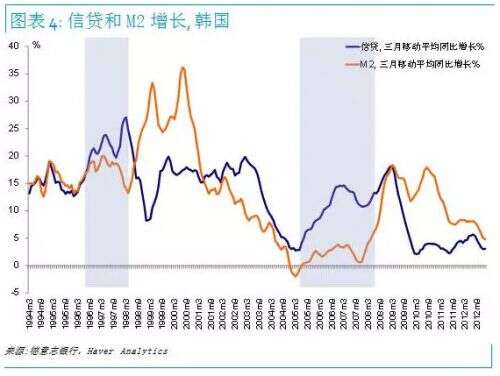 在韩国,信贷和M2增长之间的差值从1996年8月、亚洲金融危机开始之前出现,在1998年三月达到13%的顶峰。它在2006年到2007年全球金融危机之前再次扩大(图4)。