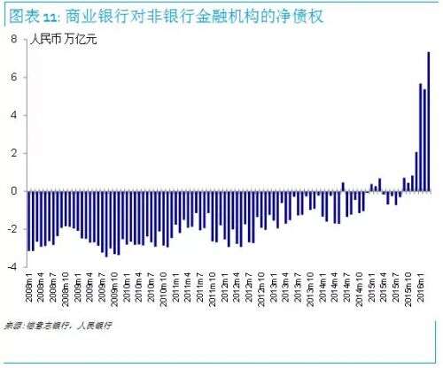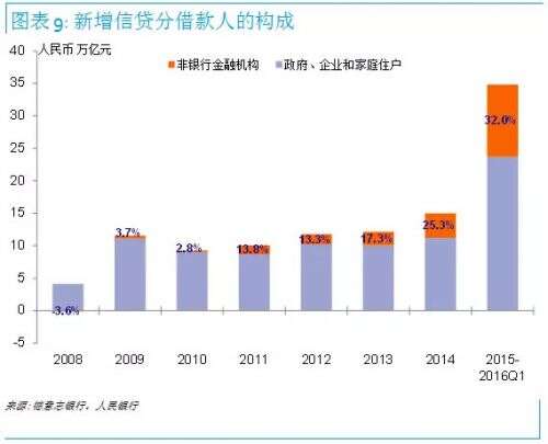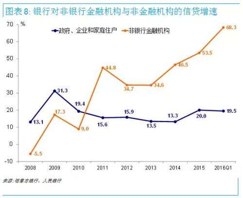 另一个表明非银行金融机构重要影响的标志是它们与银行净借贷余额的转变。在2008年和2014年初间,非银行金融机构整体上一直是商业银行的净债权人。这种情况在2014年6月第一次发生转变,然后从2015年中开始,非银行金融机构已经明确成为银行的净借款人。在2016年3月,他们从商业银行系统的净借款达到人民币7.3万亿元。和2014年5月比,净借贷头寸在21个月内的变化达到了9万亿元。
