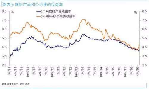 我们认为,造成这一现象的根本性的原因是中国经济增长的结构性放缓,而它产生多重影响。首先,它减少了投资机会,并降低了实体经济的整体投资回报。这削弱了投资者向银行借款并进行实际投资的意向。其次,从银行的角度来看,经济放缓压缩了利差。银行理财产品和公司债券(图7)收益率之间逐渐消失的差值就反映了这一情况。最后,从政府的角度来看,则希望通过放松货币和财政政策来稳定增长。
