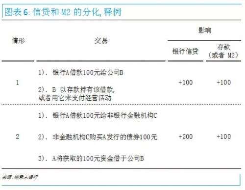 信贷增速为什么会大幅超出M2增速?答案是,银行信贷有很大一部分通过非存款渠道循环回到银行体系内部。我们举两个简单的例子来进行说明(图6)。在通常的情况下(例1),当银行A借款100元给B公司时,银行信贷上升100元,银行的存款(M2)也会上升大约等同的数额。这是因为B公司或者会将该贷款作为存款持有,或者用它来支付业务活动。在后一种情况下,该帐款的收款人也会再将存款存回银行。
