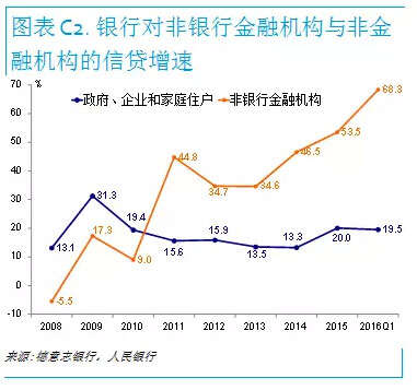 为什么会有这样的情况发生?经济增长在2015年上半年放缓,政府在2015年年中启动宽松的货币政策和财政政策,并在2016年第一季度加强了宽松力度。金融部门内大量低成本的流动性压低了市场利率。而实体经济内的产能过剩使得投资机会仍然有限。在此宏观背景下,一些金融机构可能通过加大自身的杠杆率以追逐更高的回报。这些活动往往发生在监管真空领域。