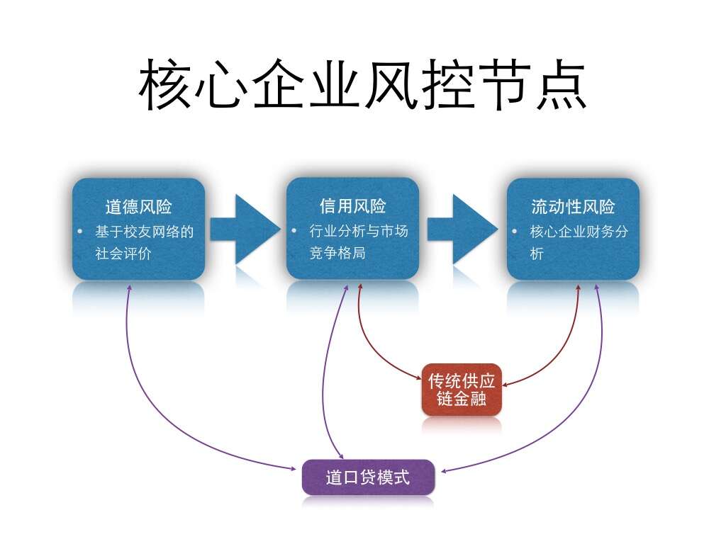 在供应链金融业务中,道口贷从核心企业资质及应收账款的质量两方面采取严格的风控措施,并始终坚持信息的完全披露。 除了利用多种专业风控模式以外,道口贷还将高端校友圈资源用于规避借款企业违约的主观道德风险。而利⽤校友间的个⼈人声誉对企业借款做增信,也属于⼀一种在担保之外全新的增信机制。