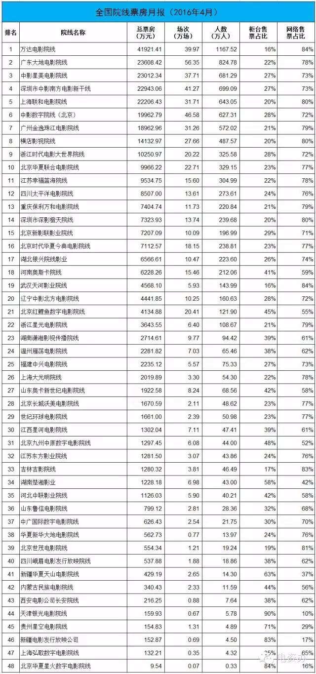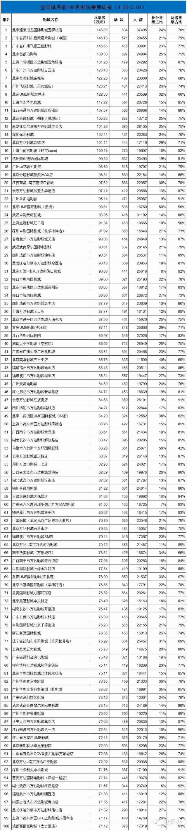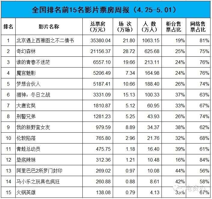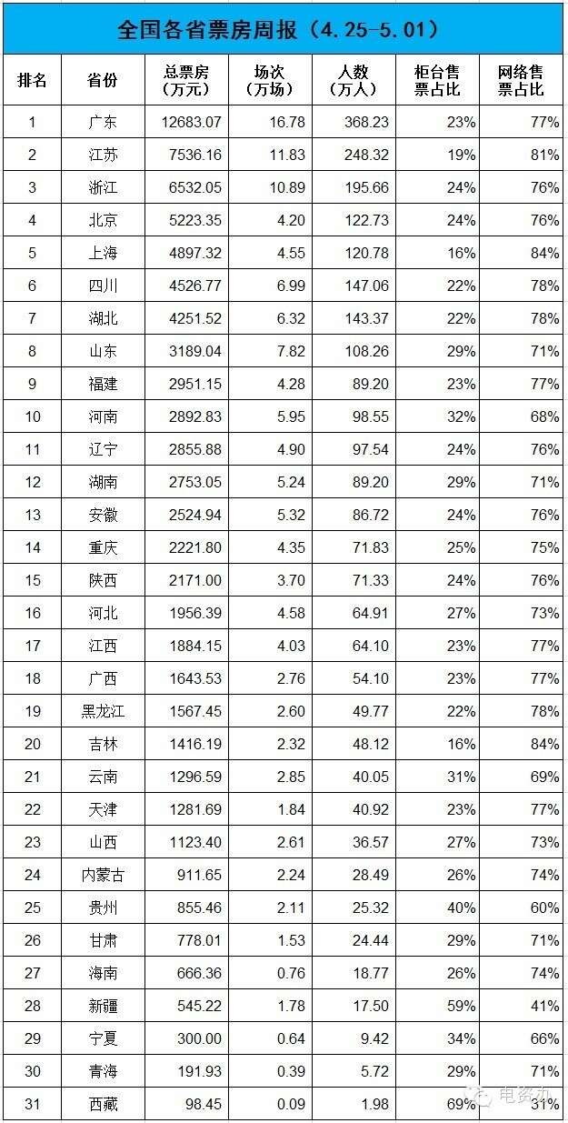 电资办:2016年4月25日-5月1日全国电影票房周报 依据全国电影票务综合信息管理系统的统计数据。4月25日至5月1日全国电影票房8.37亿元,排场136万场,观影人次2589万人。 更多阅读:电资办:2016年7月25-31日全国电影票房周报电资办:2016年3月28日-4月3日全国电影票房周报电资办:2016年9月26-10月2日全国电影票房周报电资办:2016年8月29日-9月4日全国电影票房周报电资办:2017年4月10-16日全国电影票房周报电资办:2016年9月19-25日全国电影票房周报电资办:2016年6月6-12日全国电影票房周报电资办:2016年5月30日-6月5日全国电影票房周报电资办:2016年5月23-29日全国电影票房周报电资办:2016年5月2-8日全国电影票房周报电资办:2016年7月11-17日全国电影票房周报电资办:2016年7月18-24日全国电影票房周报电资办:2016年6月20-26日全国电影票房周报电资办:2016年6月13-19日全国电影票房周报电资办:2019年2月11-17日全国电影票房周报