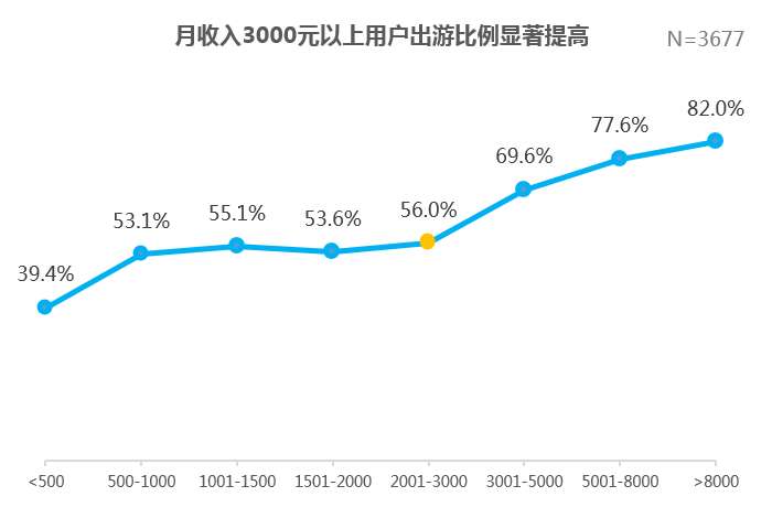 收入水平是影响出游率的重要因素。明显的拐点出现在2001-3000元区间,意味着3000-5000元月收入是触发用户出游行为的基本条件之一。