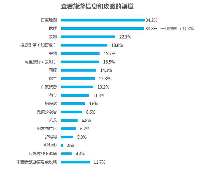 用户最常用的查看旅游信息和攻略的渠道中,百度地图、携程和搜索引擎占比最高。其中搜索引擎在二线城市的使用率显著高于平均水平。